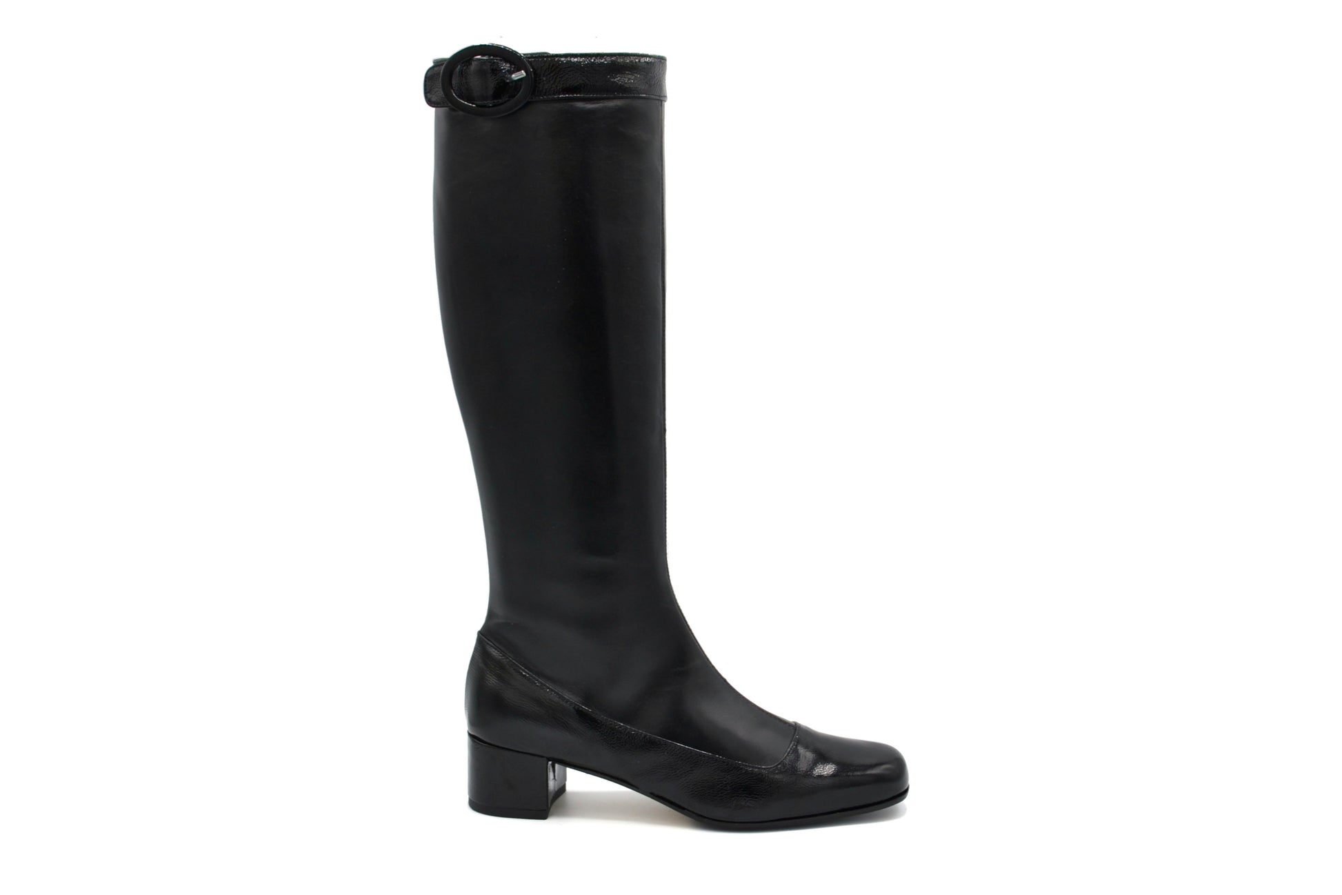 Gli stivali Bice realizzati in pelle in vernice con fibbia al gambale.