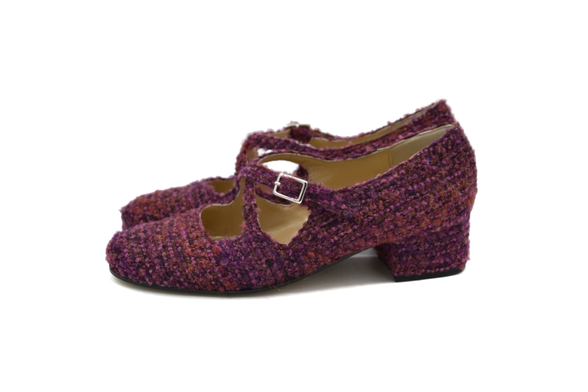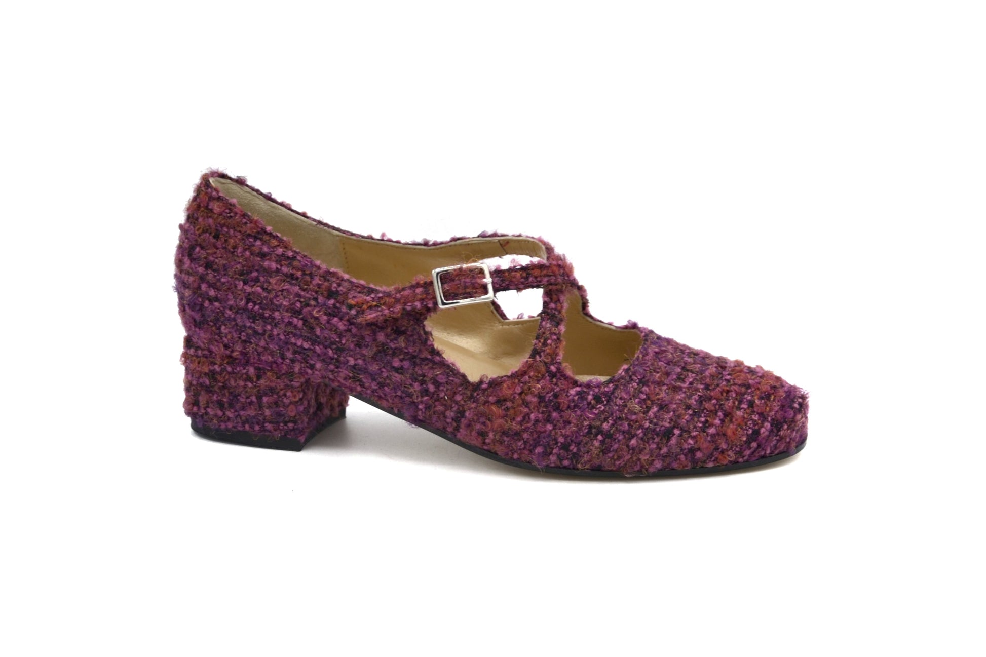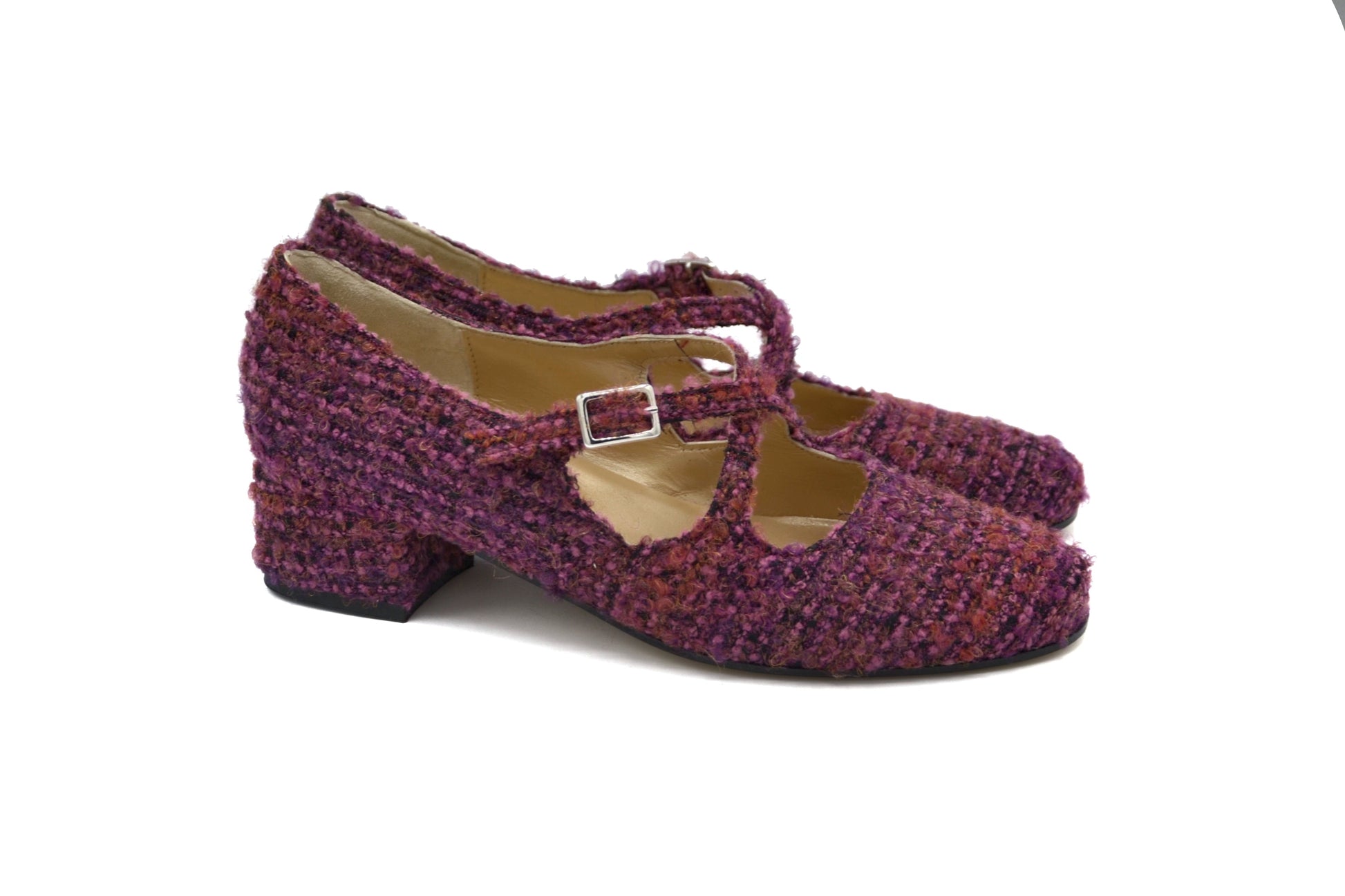 Le décolletés Iris realizzate in tessuto bouclè con cinturino charleston.