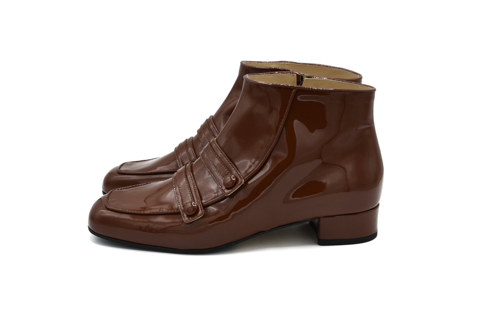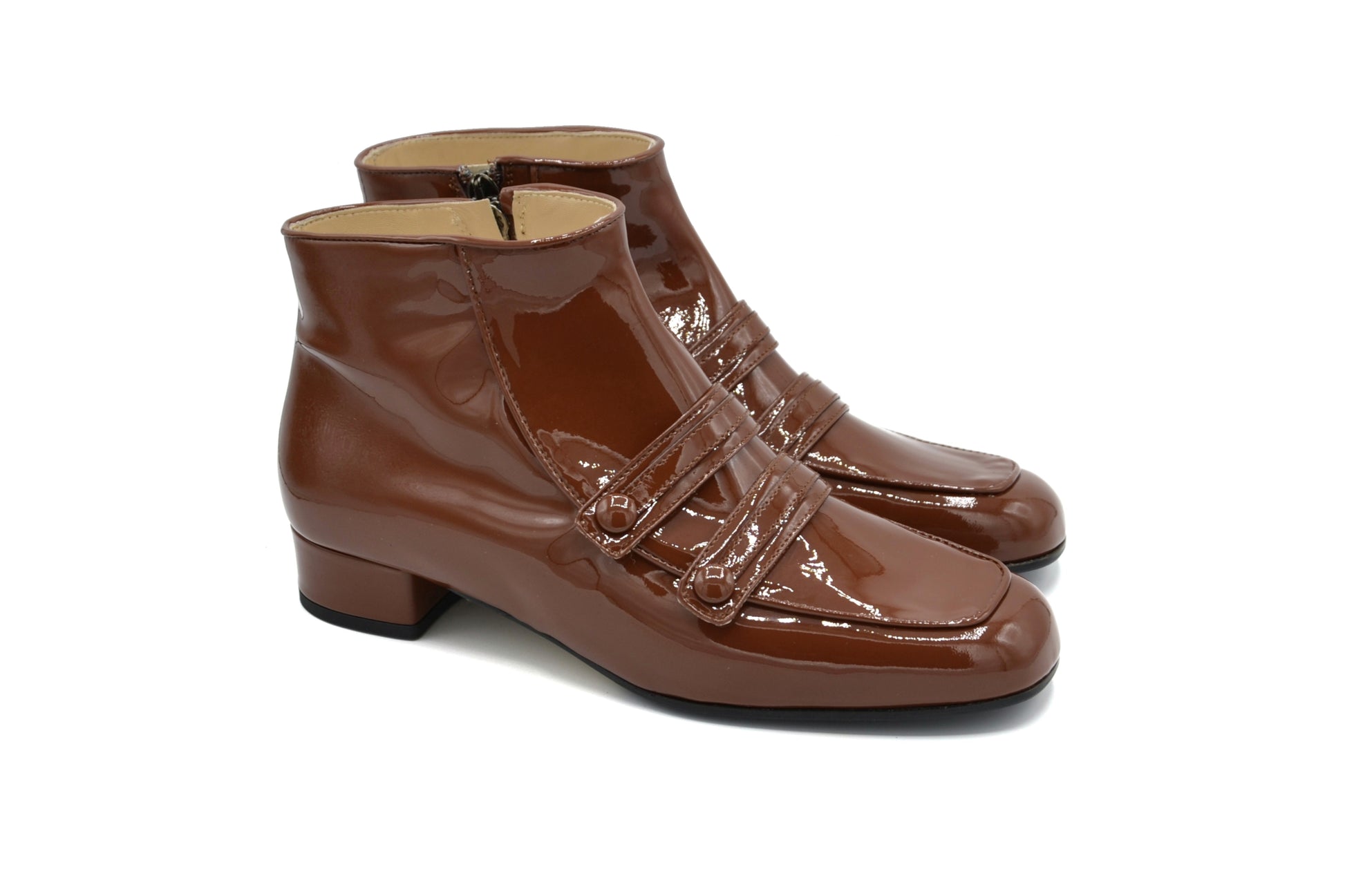 Gli stivaletti Febe realizzati in pelle in vernice.