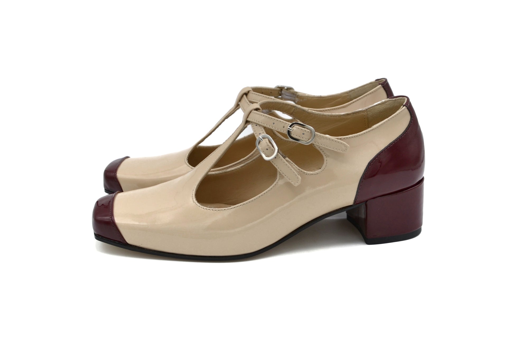 Le décolletés Amelia con doppio cinturino, realizzate in pelle in vernice.