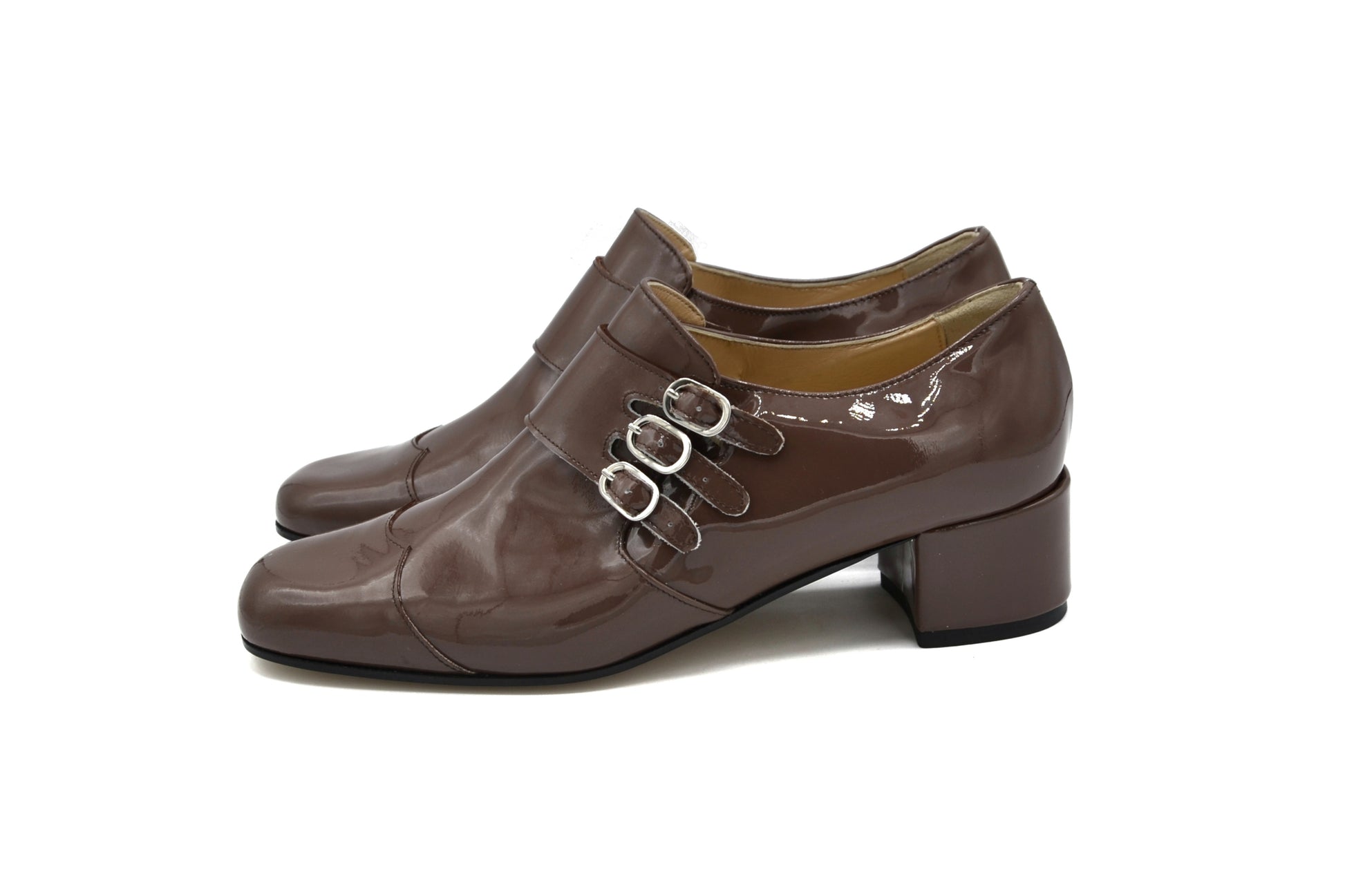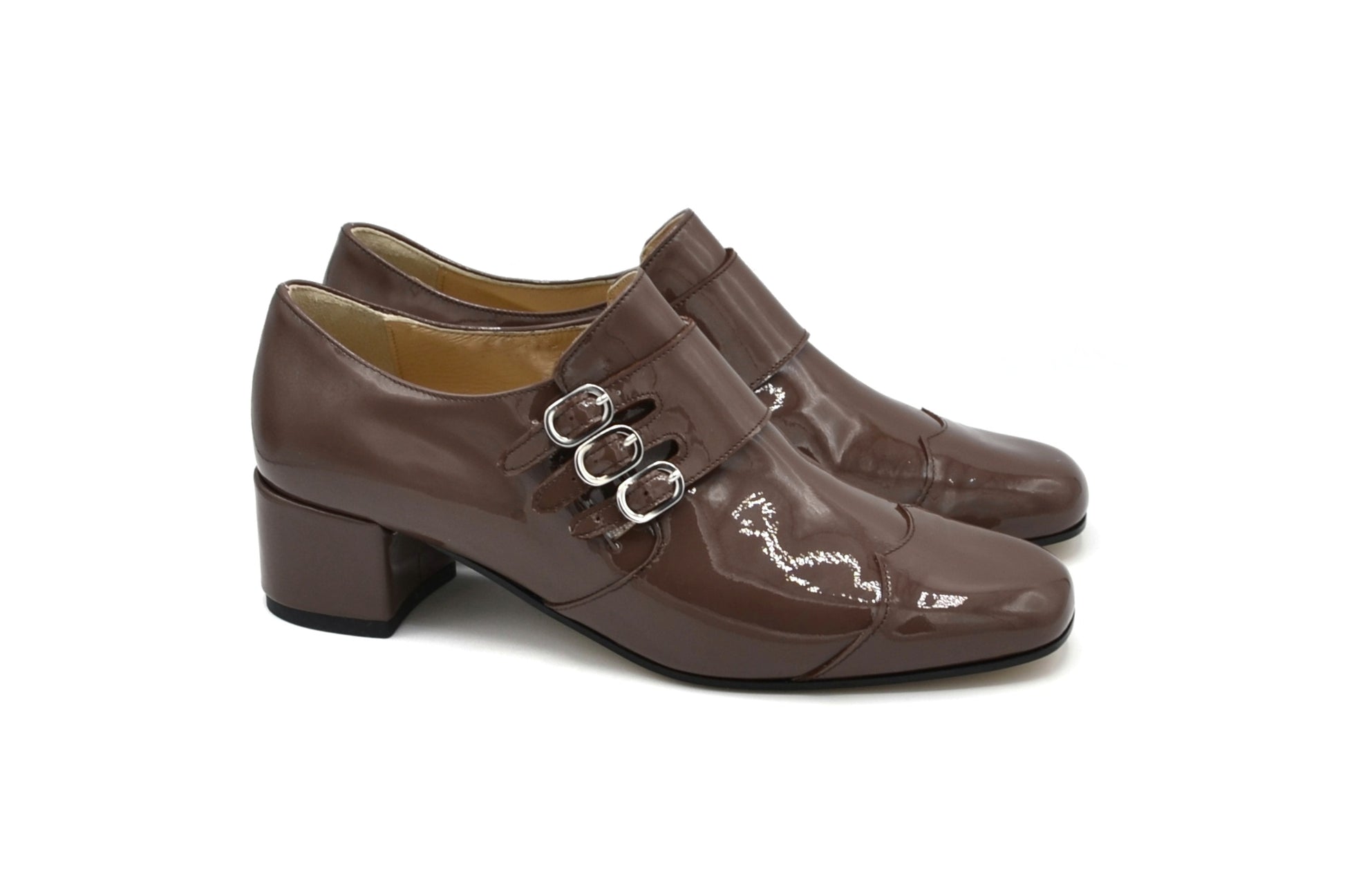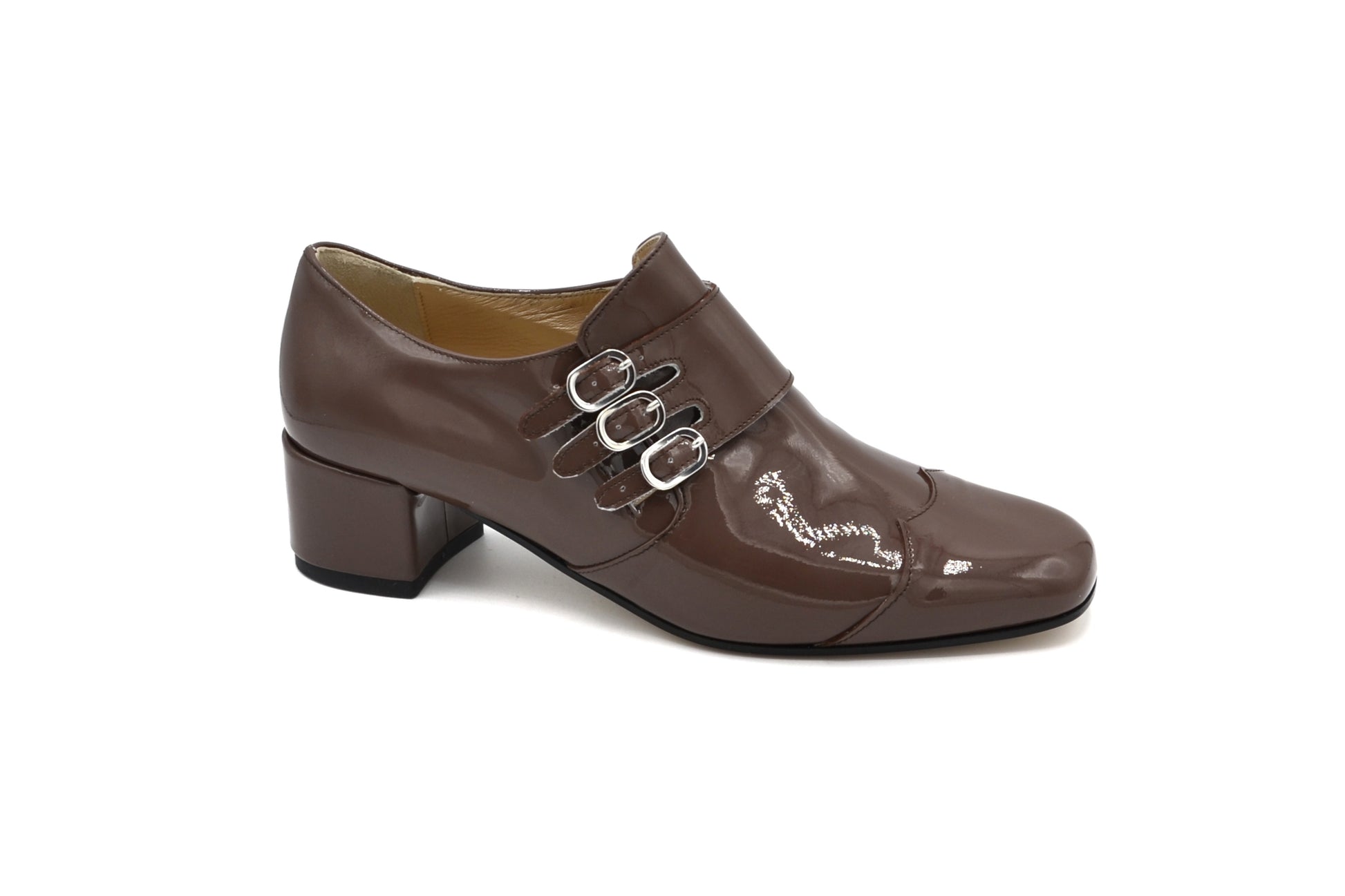 La derby Astrid con triplo cinturino, realizzate pelle in vernice.